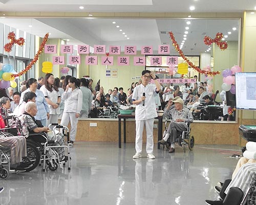 活动现场,由医护人员、志愿者们以及各老年病友们表演的 节目内容丰富、精彩纷呈,有歌曲《我和我的祖国》、《涛声依旧》、《流星雨》,朗诵《水调歌头》、现场书法、生日会、街舞、京剧、游戏等节目。悠扬的曲韵,高亢的歌声,精彩的游戏赢得全场阵阵掌声。台下的各位老人们一边享用精美可口的水果点心,一边不时的跟着哼唱互动,现场气氛十分热烈。