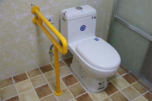 (2)脱下裤子手扶墙上横扶手,安稳地移坐在坐便器上;
