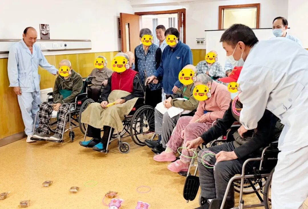 活动在热闹非凡的“趣味套圈”环节中拉开帷幕。平日里安静的病区活动区,瞬间变成了充满欢声笑语的游乐园。工作人员提前准备了饮料、零食、小工艺品等丰富奖品,整齐地摆放一地。长者们个个兴致勃勃,跃跃欲试。“瞄准,扔!”“哎呀,差一点!”“套中啦!太棒了!”……现场欢呼声、喝彩声、鼓励声此起彼伏。只见他们屏息凝神,手腕轻轻一抛,彩圈在空中划出一道优美的弧线,稳稳地套中了心仪的奖品,脸上露出了孩童般灿烂的笑容。