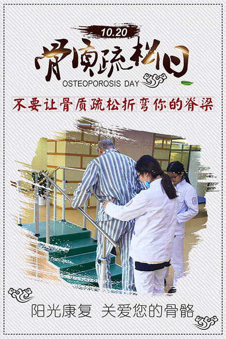 骨质疏松症是中老年人的常见病、多发病,位居中老年人五大疾病患病率之首。如今已成为困扰老年人群的主要疾病,其发病率已经紧随糖尿病、老年痴呆,跃居老年疾病第三位。为引起民众对骨质疏松症防治的足够重视,世界卫生组织(WHO)将每年10月20日定为世界骨质疏松日。