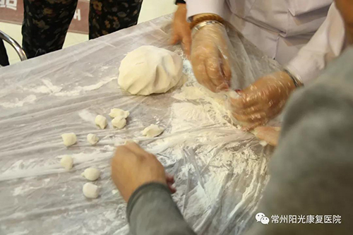 原本没安排上的爷爷看到现场这么热闹,不甘在旁边再这么干坐着,推着轮椅也迫不及待的加入汤圆制作现场了。