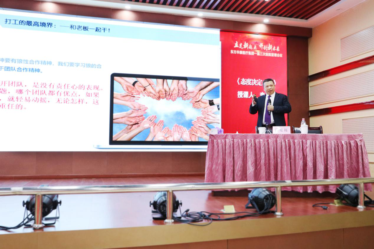 首先,东方华康医疗集团总裁、总院长李爱川带来了《态度决定一切——职场素质提升训练》课程,分别从“态度与能力”、“团队合作状态”、“打工的最高境界—和老板一起干”三个方面进行详细讲授,现场深入浅出,为每种类型的员工找准定位,团队合作中的所需要具备的状态和树立的信念,以及以老板的心态来干工作等方面展开,为现场所有管理层和集团员工树立职场观、人生观上了生动的一课。同时,他表示,希望所有同仁都能在东方华康这个平台上,不断提升自己,与东方华康共同成长。